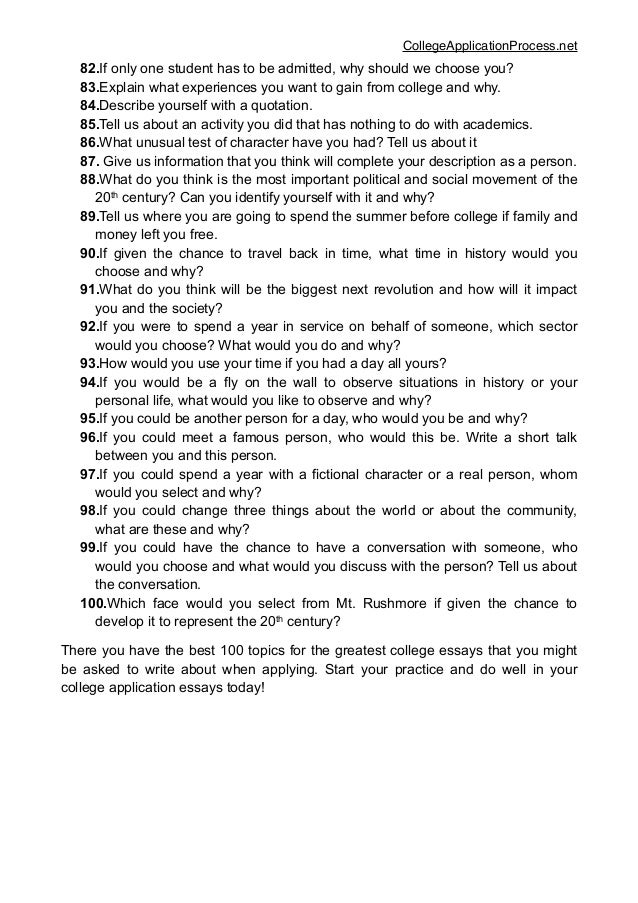 · 53 College Essay Topics to Get Your Brain Moving. In this section, we give you a list of 53 examples of college essay topics. Use these as jumping-off points to help you get started on your college essay and to ensure that you’re on track to coming up with a relevant and effective topic. All college application essay topics below are categorized by essay prompt · Ideas for Common Application Essay Prompts. Here are some useful themes that will inspire and give some tips on how to write a college paper. 1. Examine anatomy of your own achievement. If you are lucky enough to have already accomplished something meaningful, it is probably the wisest paper type to blogger.comted Reading Time: 9 mins · Pick something you love and give your top 10 — maybe top 10 memories of your life, top 10 favorite books, top 10 quotes, etc. Make sure you give clear explanations of the items on your list as well. The more specific your list is, the better. Tell us a topic that you have changed your mind on in the past three blogger.comted Reading Time: 9 mins