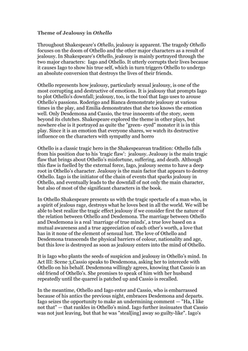 Finally, Iago uses Cassio and Desdemona to make Othello think and suspect that Desdemona is cheating on him. Iago gets Cassio drunk so he will get in a fight because he wants Cassio to be in trouble with Othello and while that is happening he knows Desdemona will intervene and try to help Free othello essay on jealousy. Iago is willing to exploit everyone just to get even with Othello proving that jealousy can actually lead humans to abandon their logic.